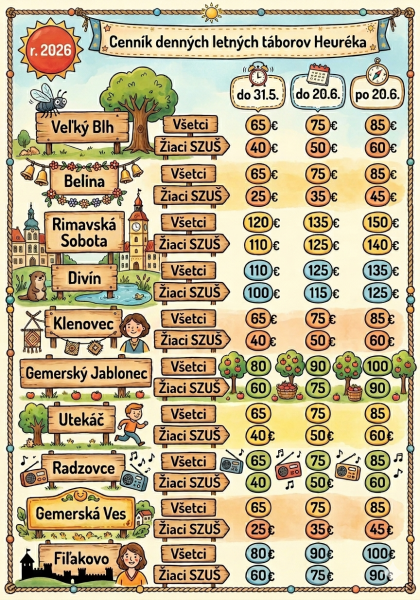 20.7. 2026 – 24.7. 2026 Letom svetomDobrodružný tábor, kde deti hravou formou spoznávajú rôzne krajiny, kultúry a tradície cez hry, tvorenie a pohyb.